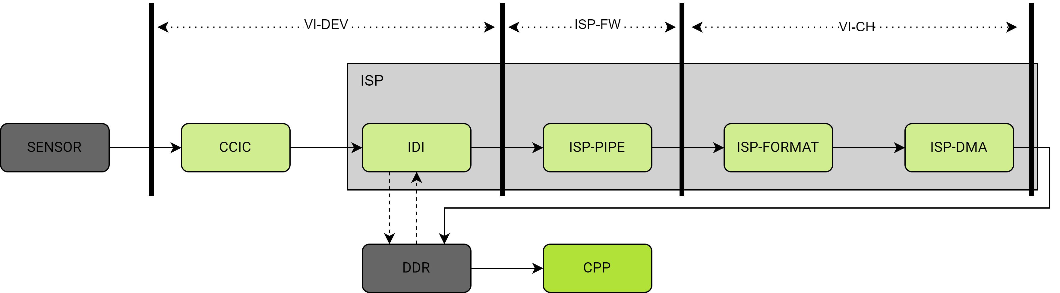 原始光信号 → SENSOR(光电转换)→ CCIC(数据接收)→ IDI(数据路由)→ ISP-PIPE(图像处理)→ ISP-FORMAT(格式转换)→ ISP-DMA(内存写入)→ CPP(后处理)→ 最终输出
