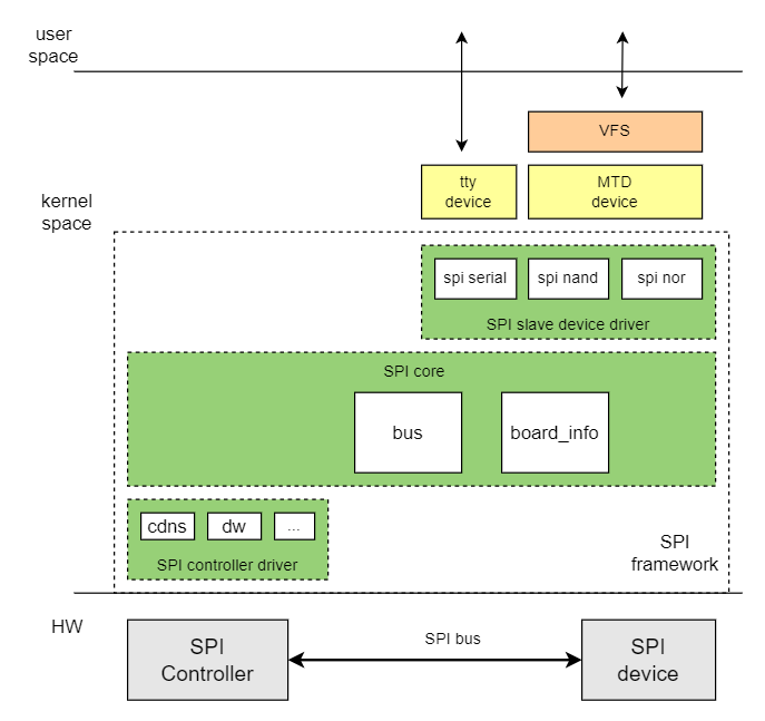Linux spi驱动框架分为三部分: SPI core、SPI控制器驱动 和 SPI设备驱动。