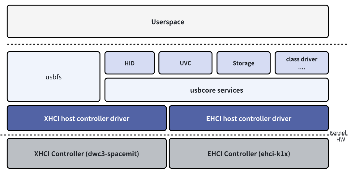 - USB Host Controller Driver: This is the USB controller driver layer, responsible for initializing the controller and performing low-level data transmission and reception operations.
