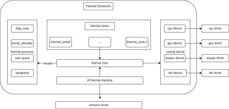 Thermal refers to a driver framework for temperature control mechanisms. The Linux Thermal framework is an architecture used in Linux systems for temperature control, primarily aimed at addressing the increasingly severe heat dissipation issues caused by the continuous enhancement of device performance.
