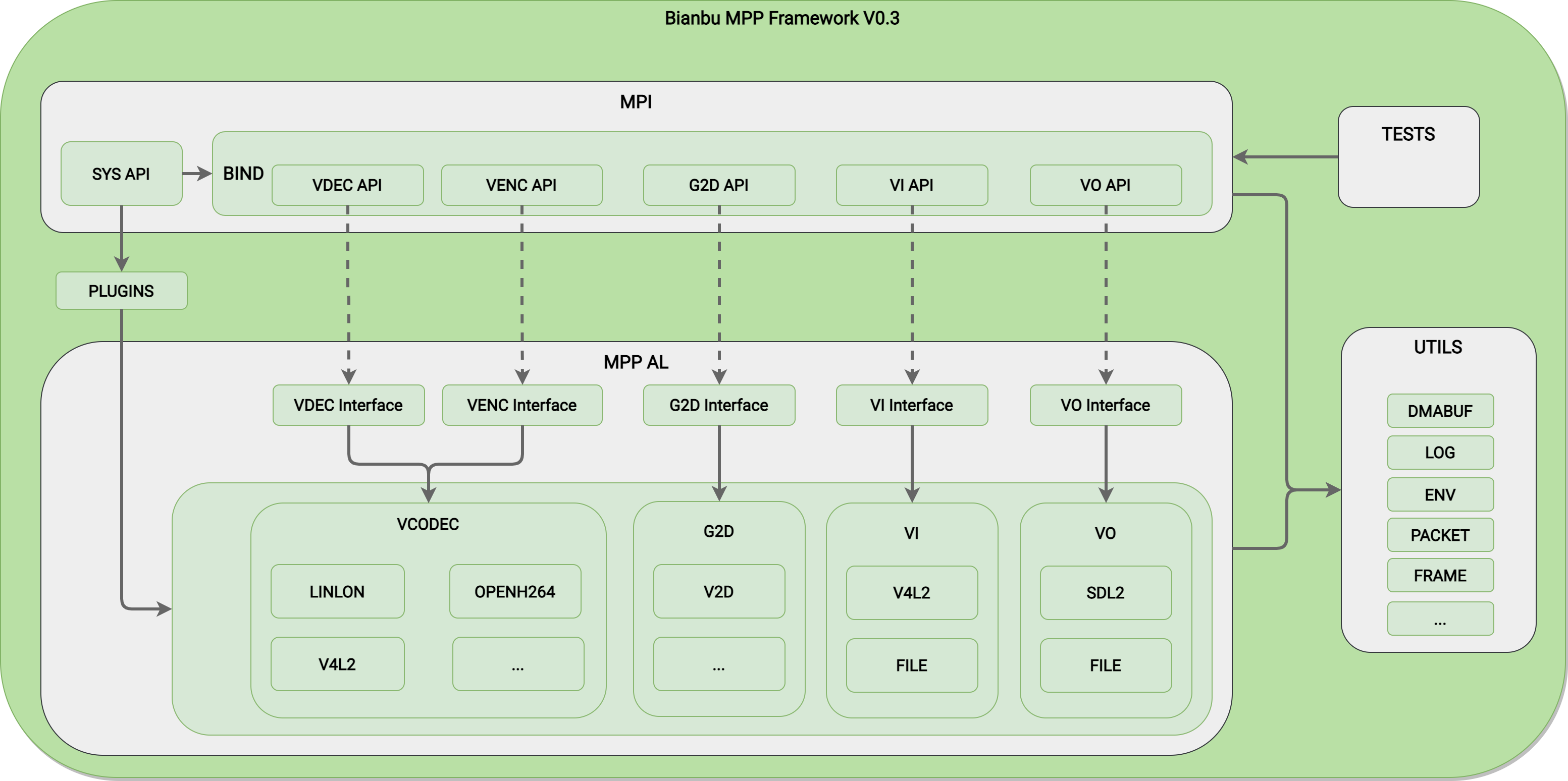 MPP (Multimedia Processing Platform,多媒体处理平台) 属于自研操作系统 Bianbu 的一部分, 用于封装不同平台硬件编解码的差异,提供统一 API 给开发者调用。